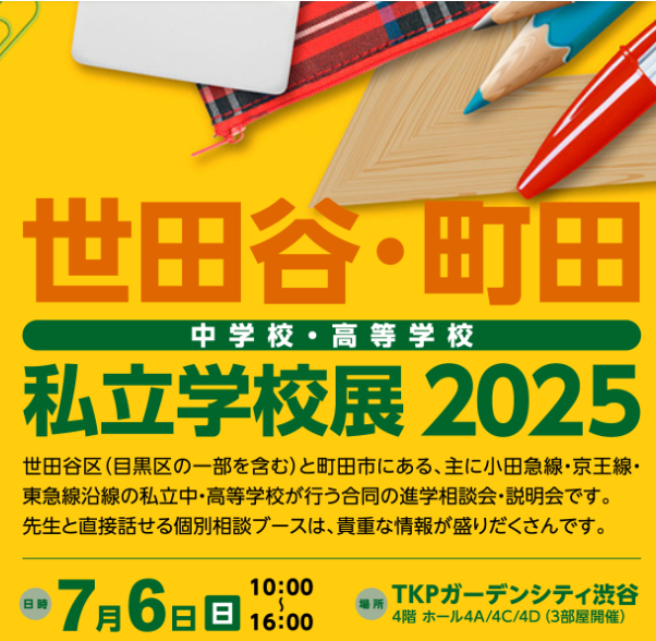 世田谷区(目黒区の一部を含む)と町田市にある、主に小田急線・京王線・東急線沿線の私立中学校・高等学校が参加して行われる合同進学相談会が開催されます。