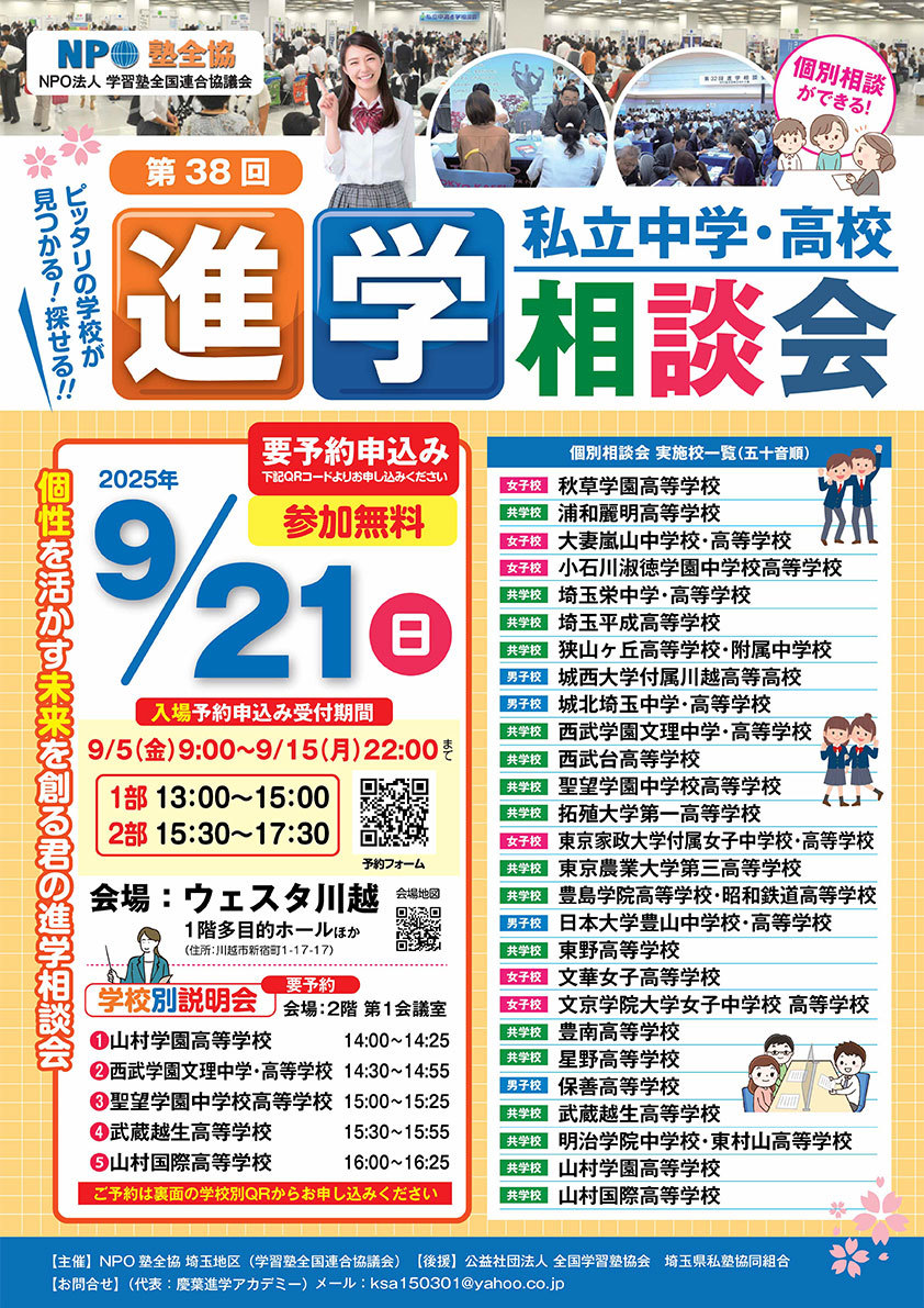 ピッタリの学校が見つかる!探せる!!「NPO塾全協 私立中学・高校進学相談会」がウェスタ川越にて開催されます。
