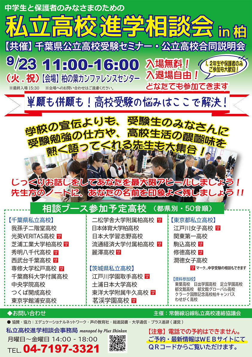 単願も併願も!私立受験の悩みはここで解決!中学生と保護者のみなさまのための私立高校進学相談会が柏の葉カンファレンスセンターにて開催されます。受験勉強の仕方や、高校生活の醍醐味を熱く語ってくれる先生方たちとじっくりお話しできます。直接進学相談ができる絶好の機会、ぜひご参加ください。