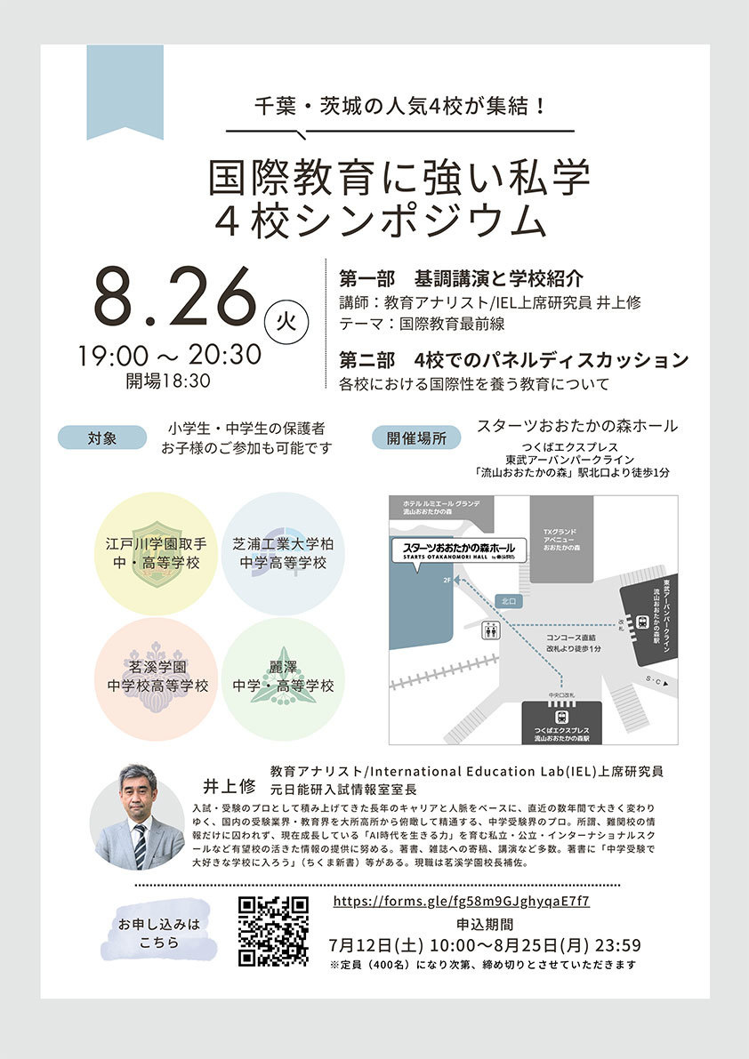 千葉・茨城の人気4校「江戸川学園取手中・高等学校」「芝浦工業大学柏中学高等学校」「茗渓学園中学校高等学校」「麗澤中学・高等学校」が集結!国際教育に強い私学4校によるシンポジウムが開催されます。